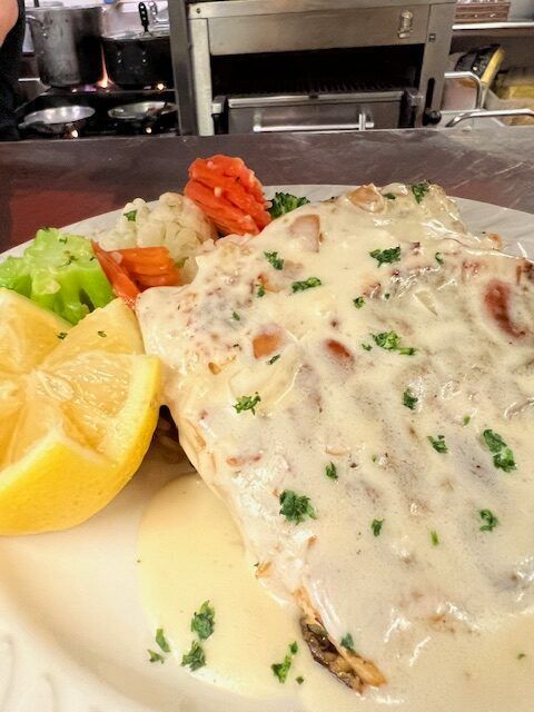 Pan Seared Trout: plated with the chef’s rich lemon butter sauce and wild rice.