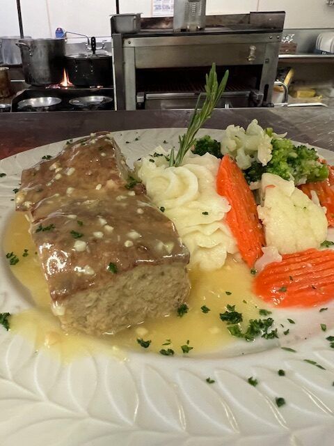 House Meat Loaf: special blend of ground beef, veal, pork and herbs. chef’s garlic sauce.
