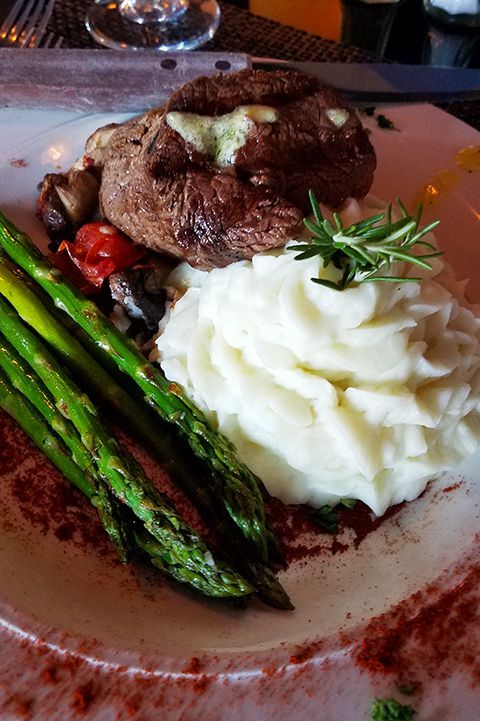 Flat Iron Steak: sliced and served with the chef’s beef burgundy porcini mushroom sauce.
